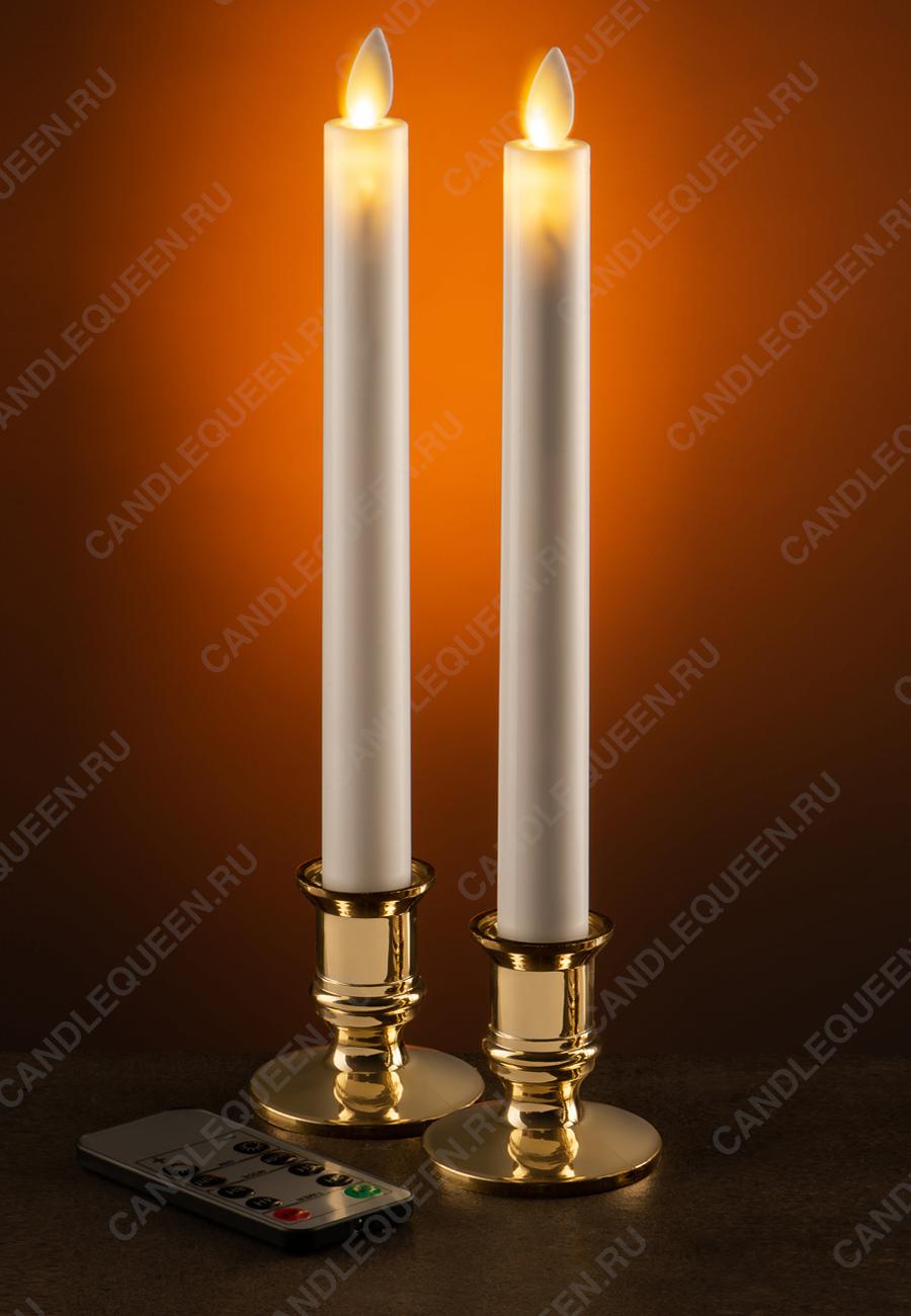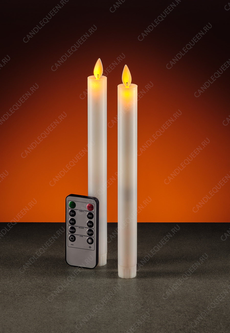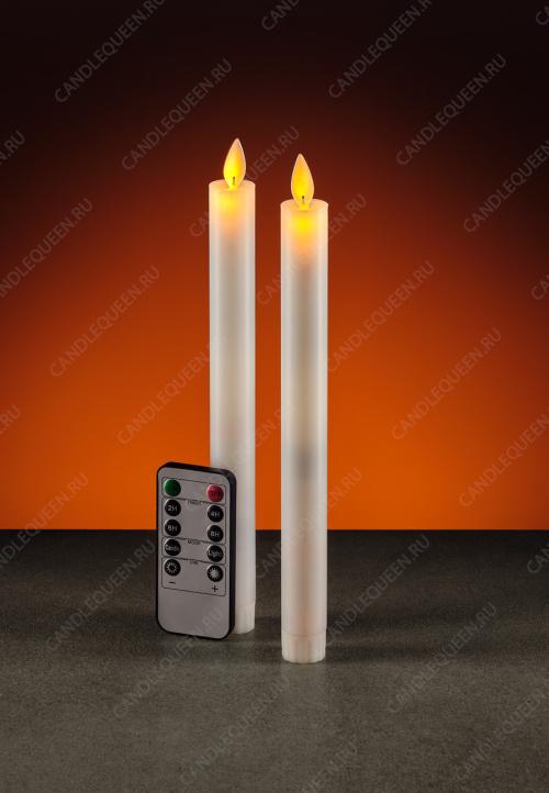 В комплекте 2 столовые свечи высотой 22,5 см (+ фитиль 2,5 см) и пульт дистанционного управления с 10 функциями.