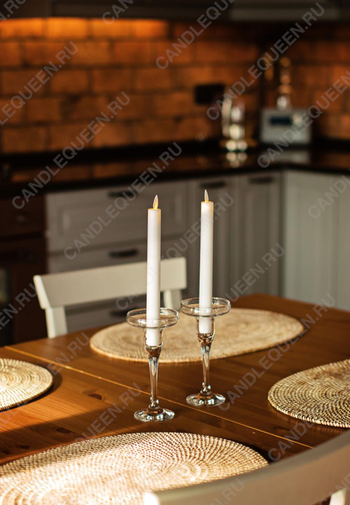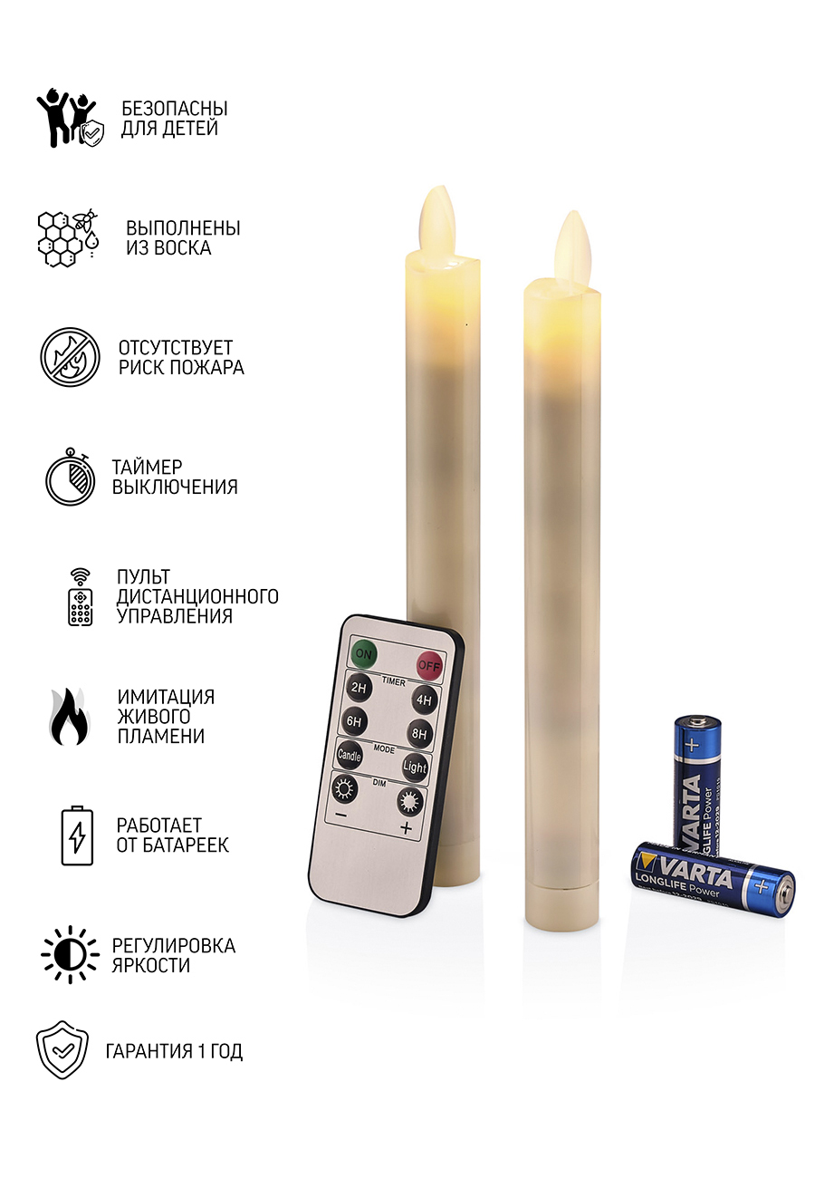 • В комплекте 2 столовые свечи высотой 22,5 см (+ фитиль 2,5 см) и пульт дистанционного управления с 10 функциями.
