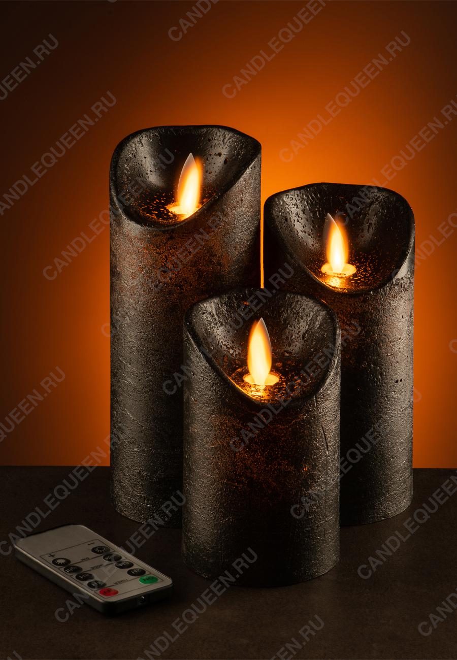 Свечи выполнены из парафина с темно-серым напылением и оснащены функцией «живое пламя», что максимально приближает их к настоящим.