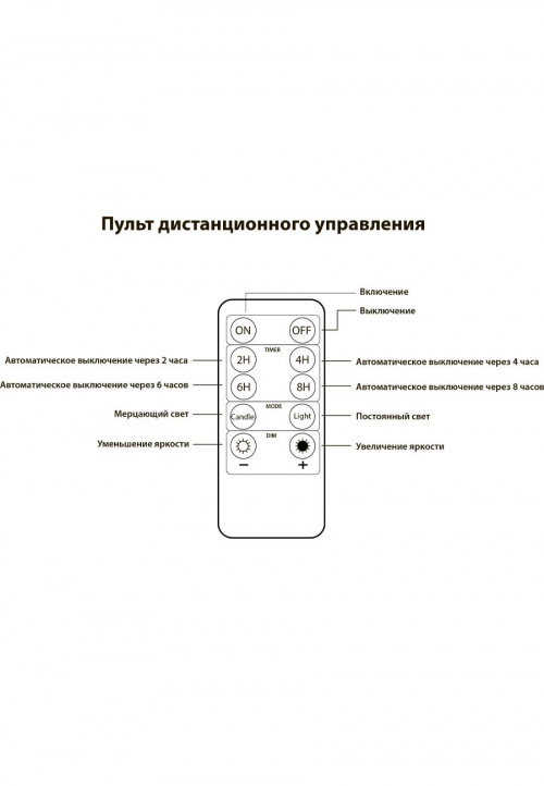 Пульт дистанционного управления позволяет разместить свечи в труднодоступных местах и управлять их работой на расстоянии: включать и выключать свечи, регулировать яркость и выбирать режим свечения. Функция таймера дает возможность настроить выключение свечей через 2 ,4 ,6 или 8 часов.