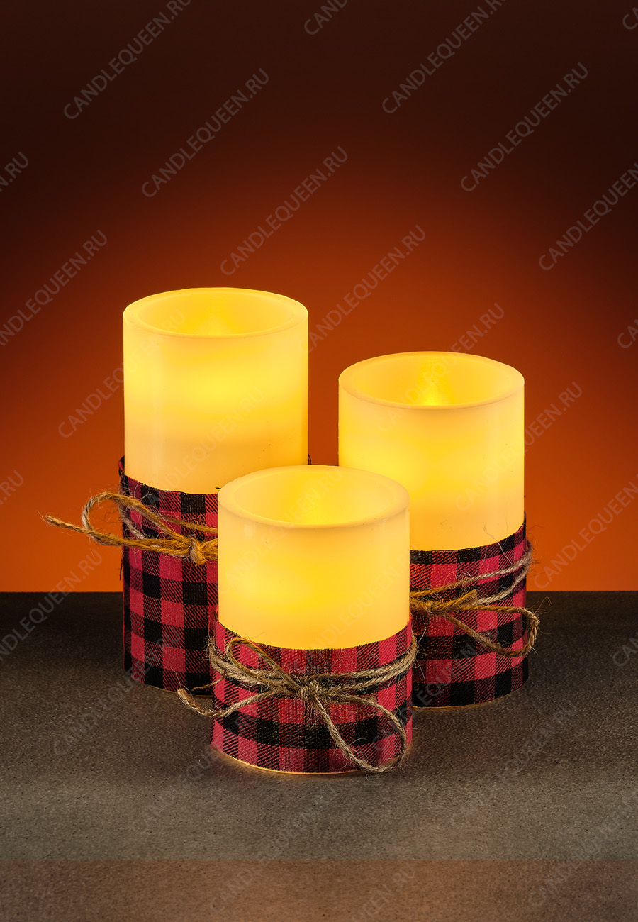 Свечи выполнены из парафина цвета айвори, а сверху обернуты материей с рисунком "шотландская клетка".