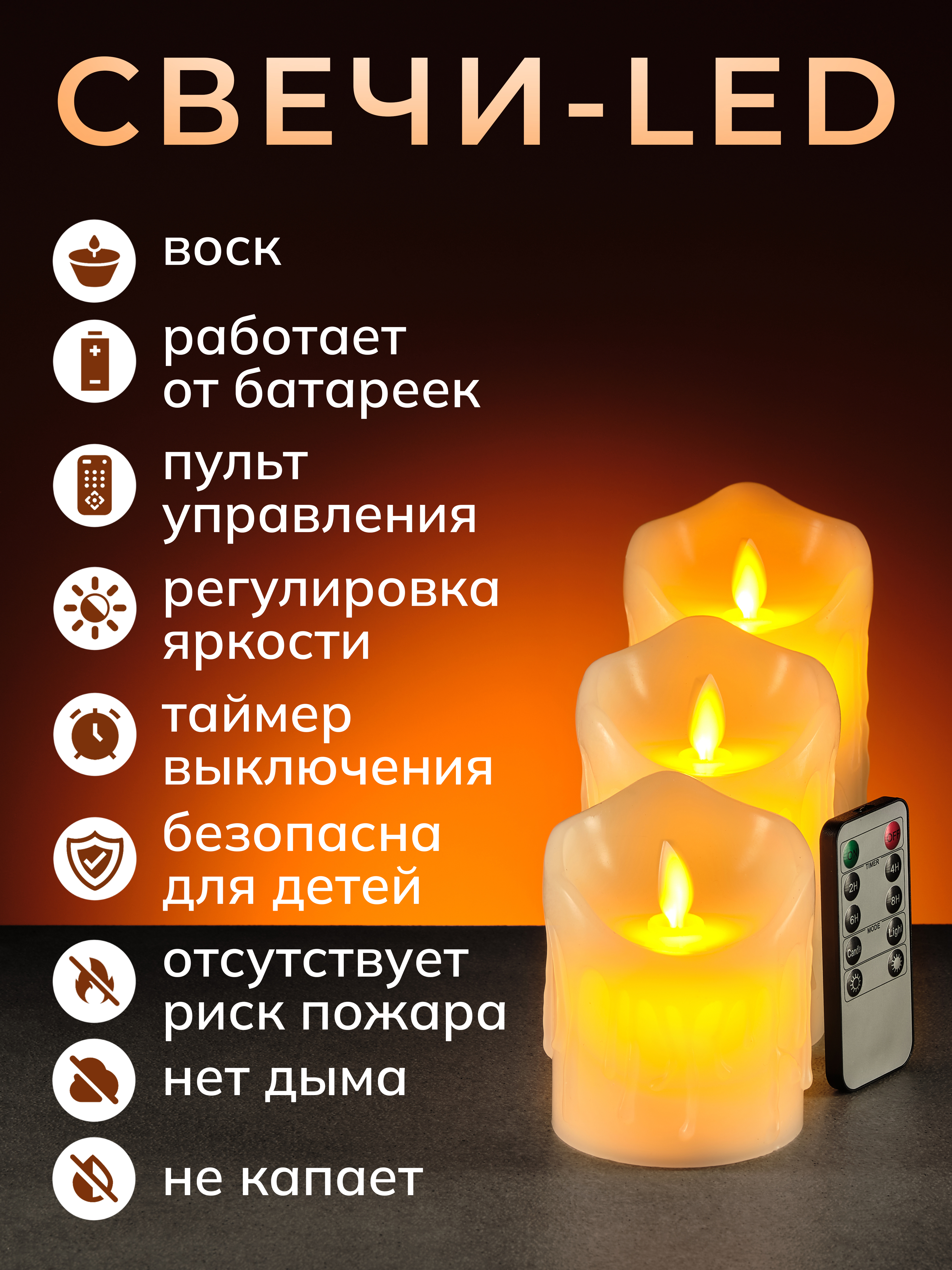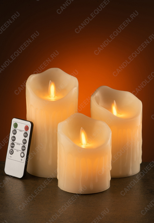 В комплекте 3 свечи высотой 10см, 12,5см, 15 см и пульт дистанционного управления с 10 функциями.