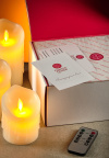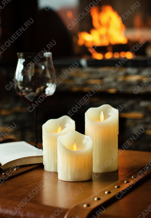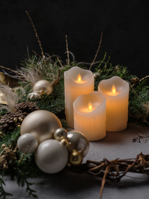 Свечи выполнены из парафина цвета айвори с имитацией стекающих восковых капель и оснащены функцией «живое пламя», что максимально приближает их к настоящим.