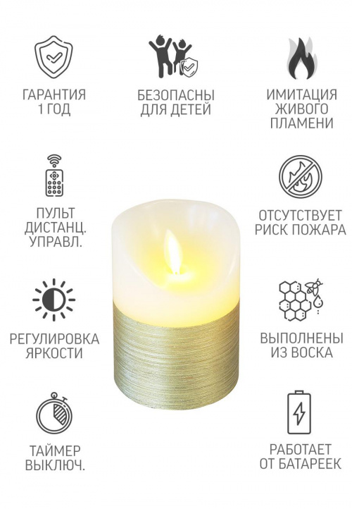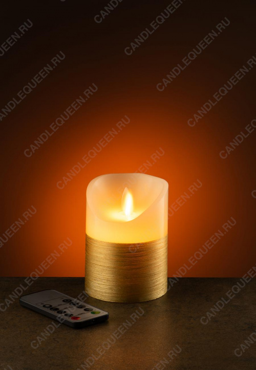 Свеча выполнена из воска цвета айвори, декорирована золотой нитью и оснащена функцией «живое пламя», что максимально приближает ее к настоящей.