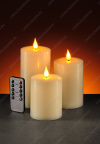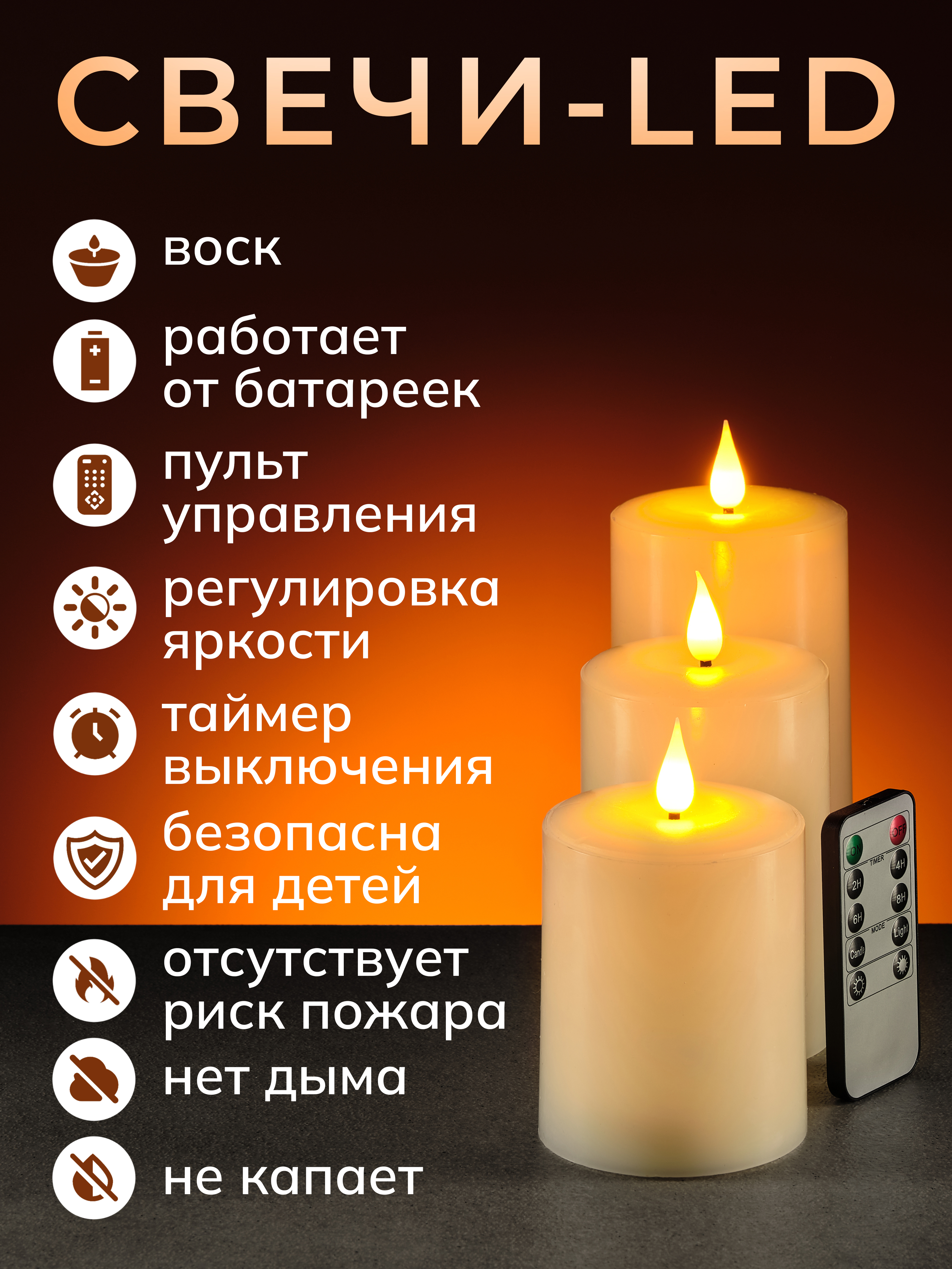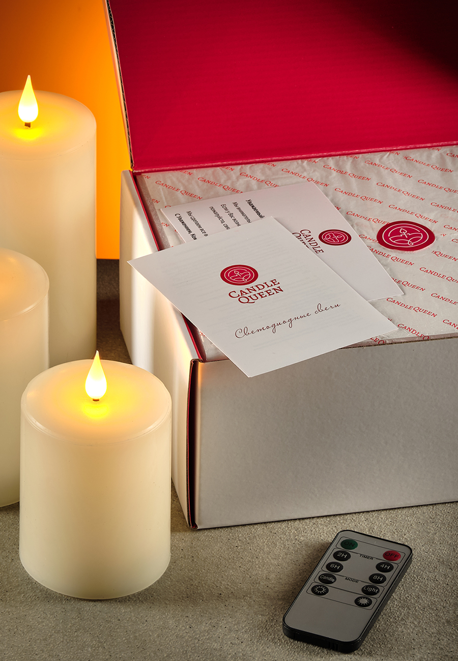 В комплекте 3 свечи высотой 15см, 12,5см, 10см и пульт дистанционного управления с 10 функциями.