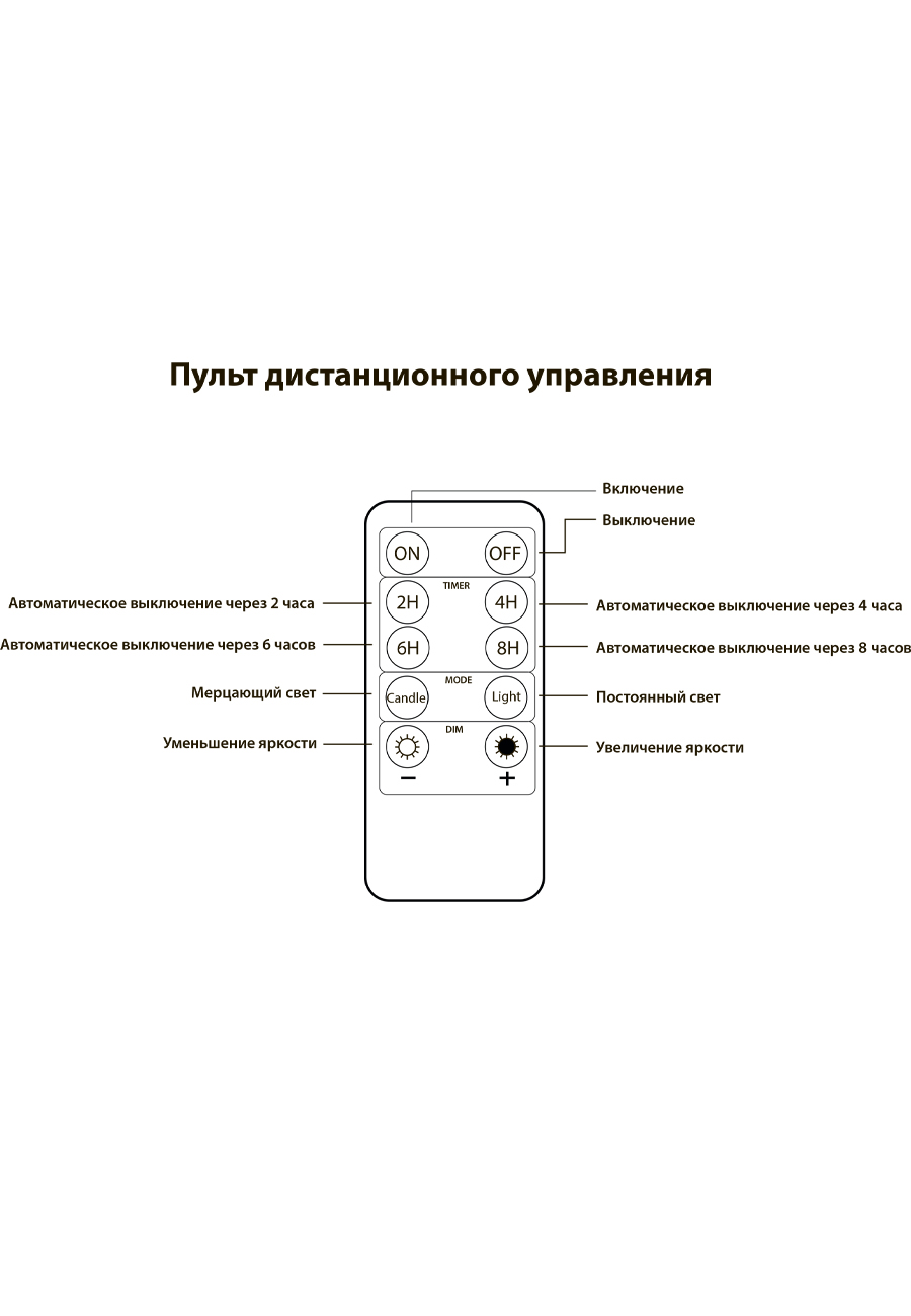 Пульт дистанционного управления позволяет разместить свечи в труднодоступных местах и управлять их работой на расстоянии: включать и выключать свечи, регулировать яркость и выбирать режим свечения. Функция таймера дает возможность настроить выключение свечей через 2 ,4 ,6 или 8 часов.