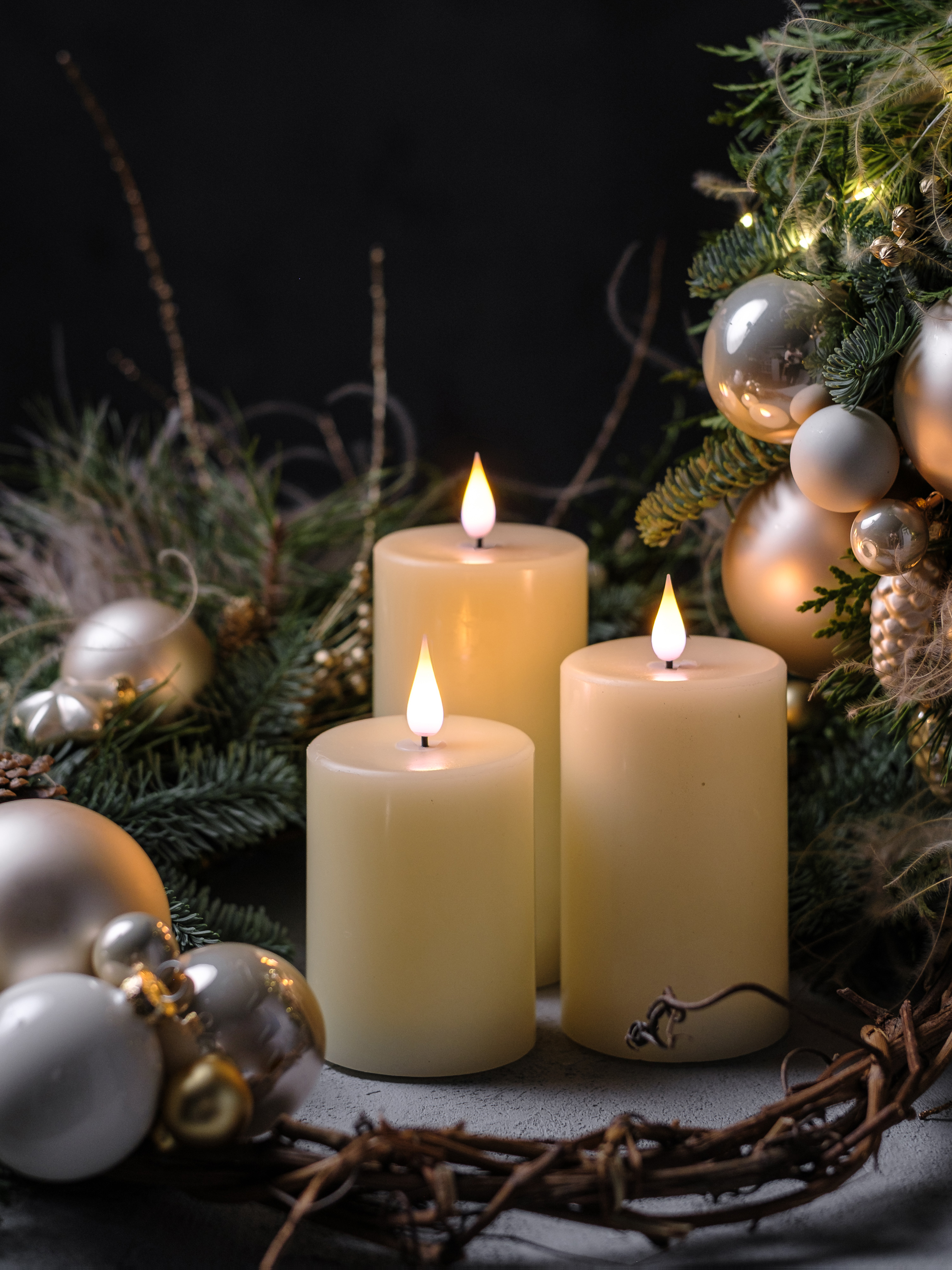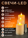Свечи выполнены из парафина цвета айвори и оснащены функцией «живое пламя», что максимально приближает их к настоящим.
