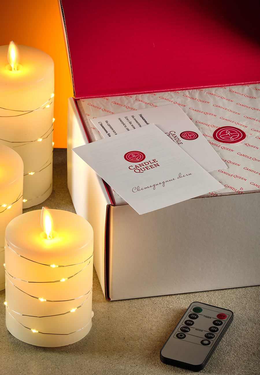 Время работы свечей Candlequeen от комплекта батарей составляет более 200 часов. Батарейки не входят в комплект поставки и приобретаются отдельно.