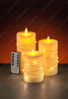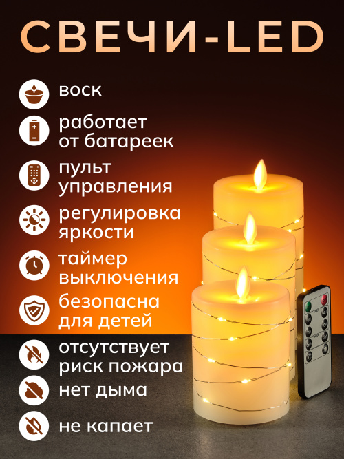 В комплекте 3 свечи высотой 15см, 12,5см, 10см и пульт дистанционного управления с 10 функциями.
